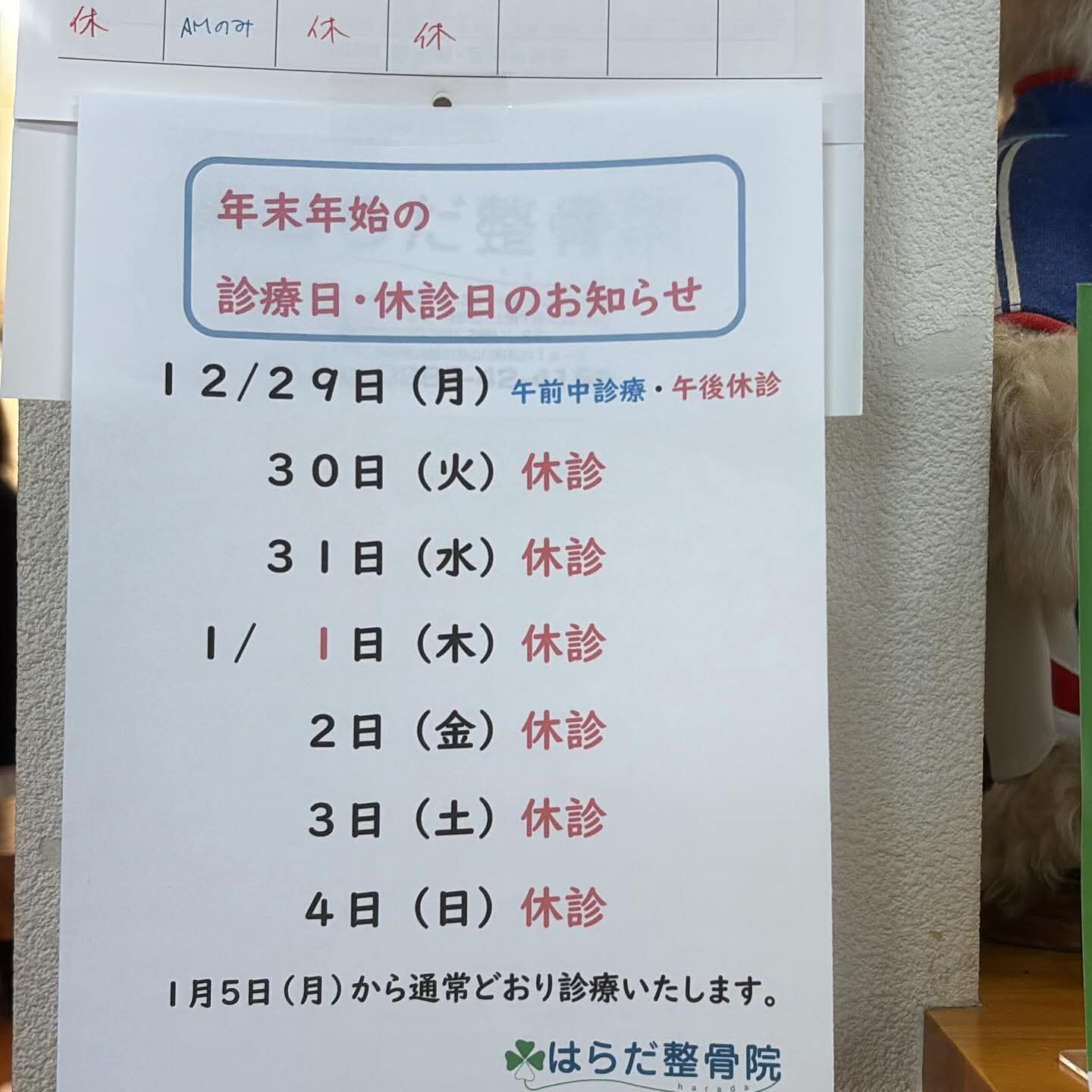 2025年-2026年 年末年始の診療日・休診日 お休みのお知らせ 2025.12.29 12月29日(月) 午前中診療 午後休診12月30日(火) 休診12月31日(水) 休診1月1日(木) 休診1月2日(金) 休診1月3日(土) 休診1月4日(日) 休診 1月5日(月)から通常どおり診療いたします。